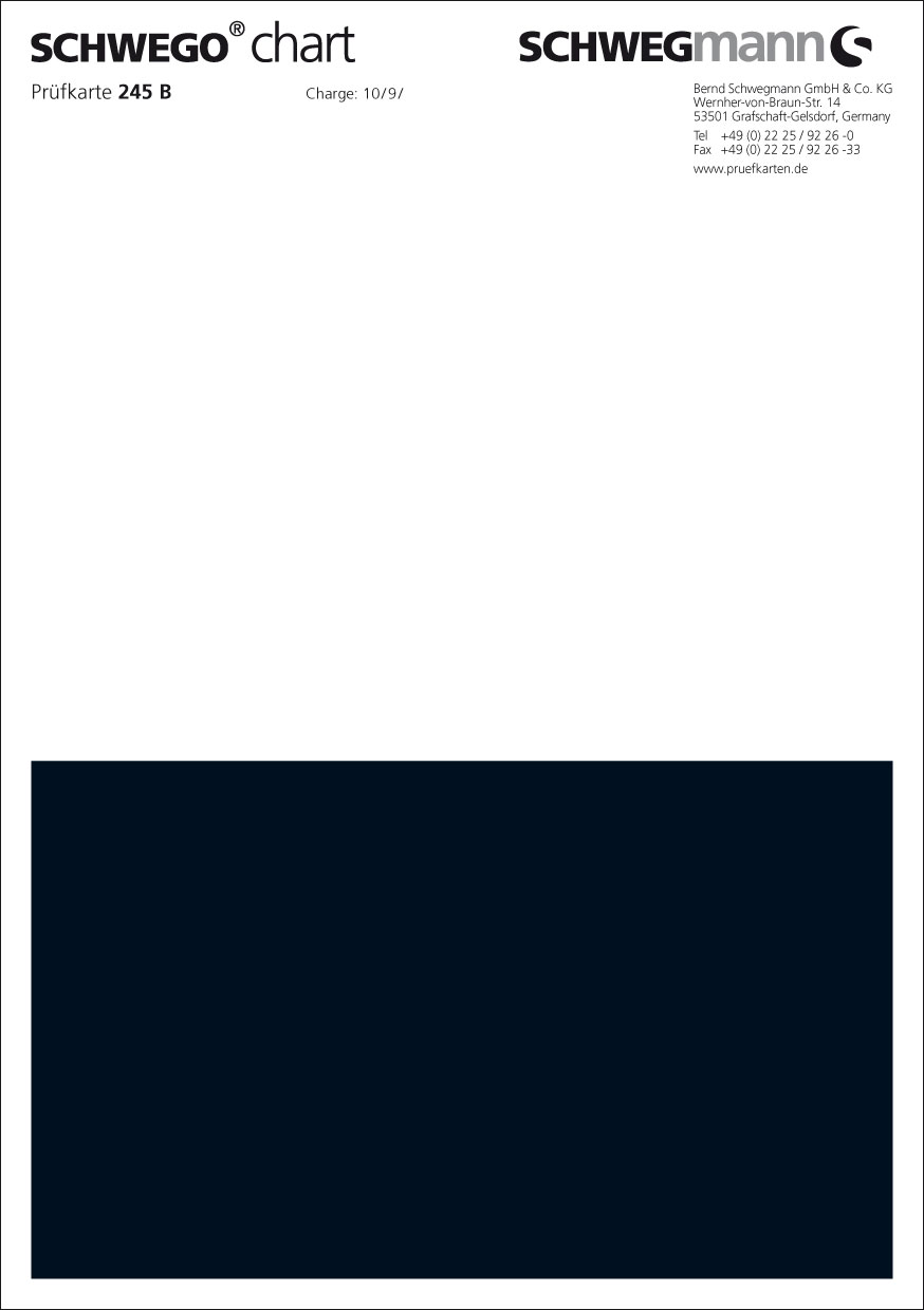 SCHWEGO chart 245 B hat eine Prüffläche von 148 mm x 180 mm / DIN A5 Format. Bei der Prüfkarte SCHWEGO chart 245 B handelt es sich um eine Prüfkarte mit schwarz-weißem Kontrastaufdruck. Die Prüfkarte ist mit einer Polypropylenkaschierung beschichtet.